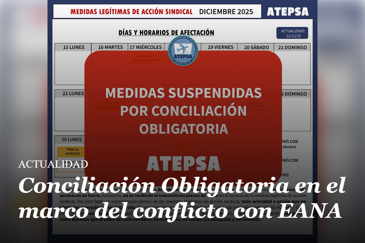ACTUALIDAD 22 de diciembre de 2025 Conciliación Obligatoria en el marco del conflicto con EANA 2 min de lectura Compartir: ATEPSA informa que EANA continúa sin atender el verdadero problema que atraviesan las y los trabajadores, dilatando el conflicto mediante la solicitud de la Conciliación Obligatoria, sin haber presentado propuestas concretas para resolver los incumplimientos Leer másConciliación Obligatoria en el marco del conflicto con EANA[…]