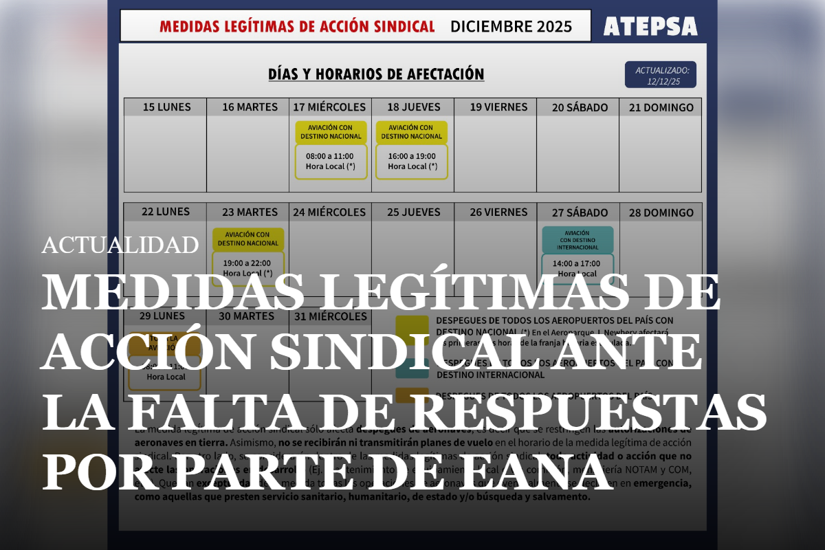 ACTUALIDAD 12 de diciembre de 2025 MEDIDAS LEGÍTIMAS DE ACCIÓN SINDICAL ANTE LA FALTA DE RESPUESTAS POR PARTE DE EANA 2 min de lectura Compartir: Estimados compañeros y compañeras: Informamos que en el marco del Conflicto Art. 80 del CCT 1512/16 E, continuarán las medidas legítimas de acción sindical, a partir del 17 de diciembre Leer másMEDIDAS LEGÍTIMAS DE ACCIÓN SINDICAL ANTE LA FALTA DE RESPUESTAS POR PARTE DE EANA[…]