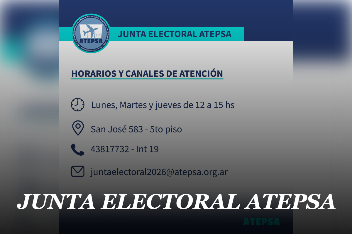 ACTUALIDAD 3 de febrero de 2026JUNTA ELECTORAL ATEPSA 1 min de lectura Compartir: Informamos a todos nuestros afiliados y afiliadas los horarios y medios de contacto oficiales de la Junta Electoral, con el fin de canalizar consultas y gestiones relacionadas con el proceso electoral vigente. Dirección: San José 583 – 5to piso. Días y Horarios: Leer másJUNTA ELECTORAL ATEPSA[…]