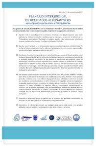 Representantes de las 7 organizaciones sindicales que fuimos parte del Plenario Intersindical votamos a favor de seguir luchando por una justa actualización de los salarios; manifestar el total rechazo y oposición a la actual política aerocomercial, ejerciendo una demanda constante en pos de las inversiones en tecnología e infraestructura que permitan asegurar un control de tránsito aéreo confiable y rechazar los modelos de reforma laboral que involucren cualquier tipo de degradación, flexibilización, precarización y perdida de garantías para el trabajador.