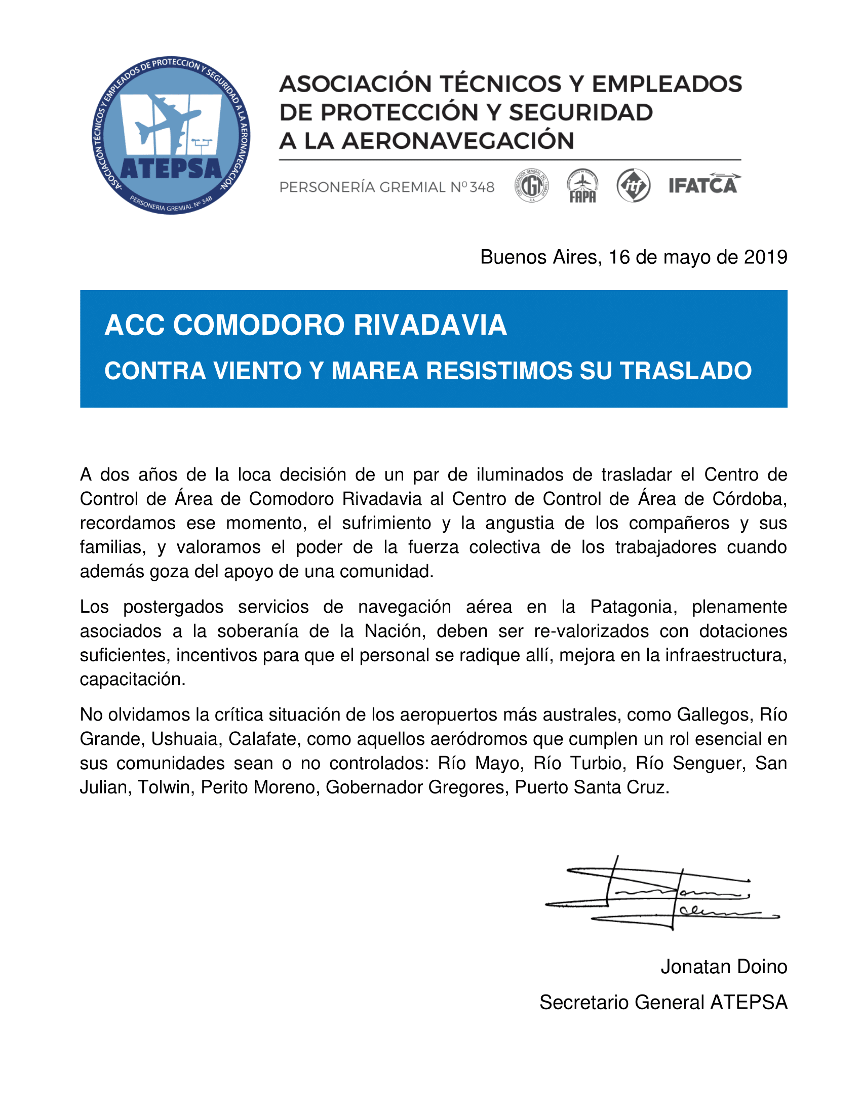 A dos años de la loca decisión de un par de iluminados de trasladar el Centro de Control de Área de Comodoro Rivadavia al Centro de Control de Área de Córdoba, recordamos ese momento, el sufrimiento y la angustia de los compañeros y sus familias, y valoramos el poder de la fuerza colectiva de los trabajadores cuando además goza del apoyo de una comunidad.