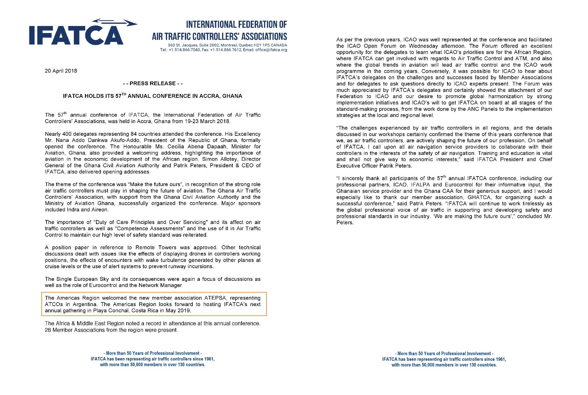 Compartimos el comunicado de prensa oficial enviado por la Federación Internacional de Asociaciones de Controladores de Tránsito Aéreo (IFATCA) a sus afiliados en todo el mundo, donde se da la bienvenida a ATEPSA como representante de los controladores de tráfico aéreo de Argentina.
