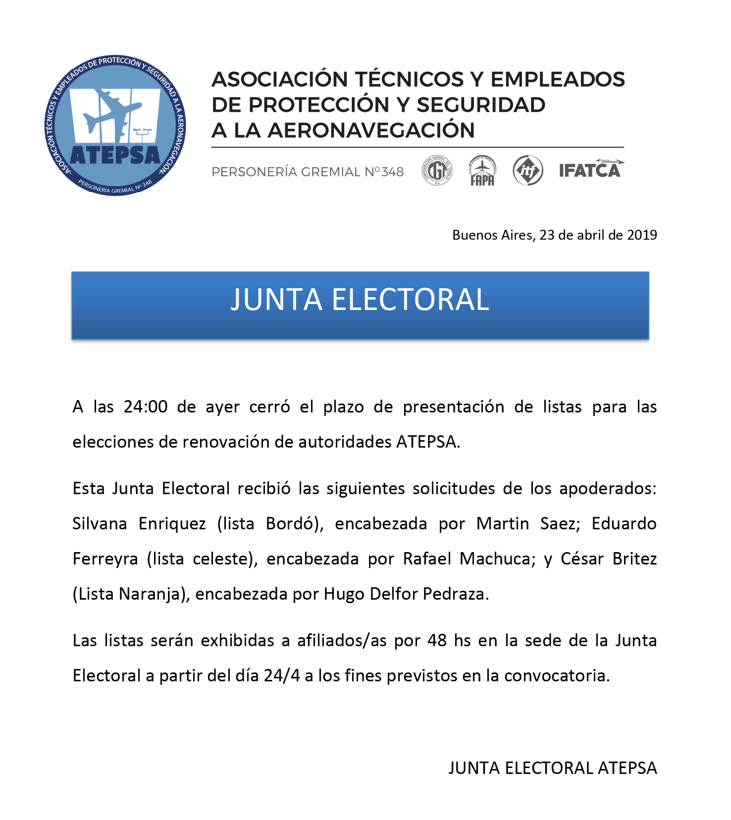 A las 24:00 de ayer cerró el plazo de presentación de listas para las elecciones de renovación de autoridades ATEPSA.